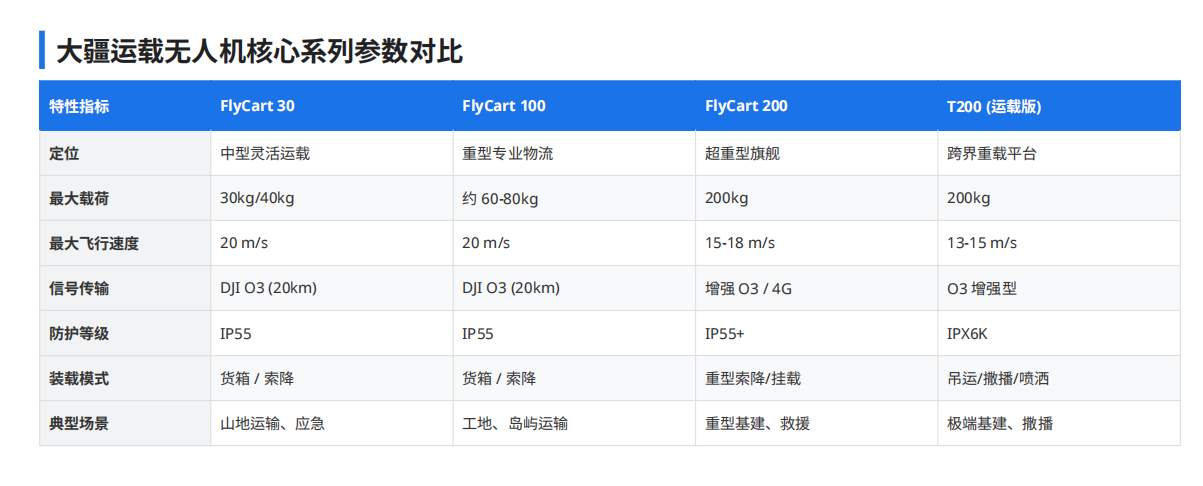 3.应用成熟于重载化扩展(2024-2025年): 随着FC30在山地、电力施工、应急物资投送等场景的快速应用和强劲需求,应用场景成熟后,市场对载重能力提出了更高需求。大疆随后推出FlyCart 100,将载荷能力从30-40kg的等级提升至更高量级。